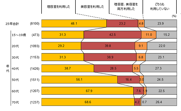 また、「理容室を利用」は48.1%、「美容室を利用」は23.2%、「併用」は4.8%でした。理容室派と美容室派の割合も年代によって異なり、15~19歳から30代までは美容室派が多く、40代以上では年齢が上がるほど理容室派が増える傾向にあります。15~19歳では美容室派が多く、併用派が11.0%と比較的高いのが特徴です。併用派は高齢になるほど減少しています。